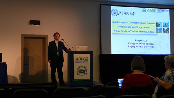 IUGG会议期间,徐宗学教授除了先后多次参加IAHS与ICWRS理事会和工作会议外,还先后应邀介绍了其研究成果 "Spatiotemporal characteristics of extreme precipitation and temperature: A case study in Yunnan Province, China”与"Climatological features and trends of extreme precipitation during 1979-2012 in Beijing, China”,并应邀作了精彩的学术报告。