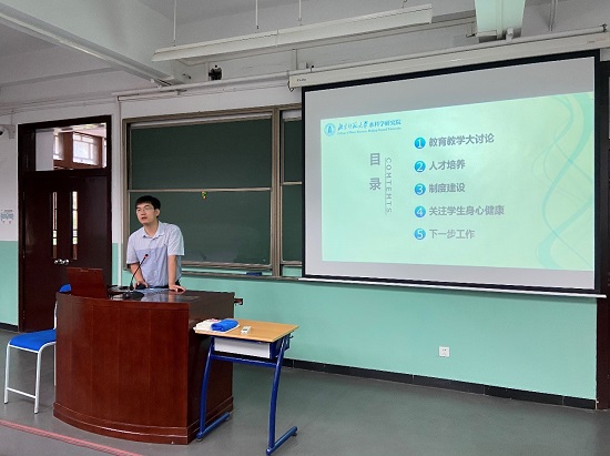左德鹏院长助理对人才培养做了详细汇报,主要包括教育教学大讨论、人才培养、制度建设、关注学生健康和下一步工作计划。重点做了教育教学大讨论的宣贯介绍和工作汇报,鼓励教师们参与到这次活动中,查漏补缺,反躬自省,推动教育教学深化改革。在硕博人才培养方面,分别从招生、课程、国际交流、毕业方面进行了数据分析,指出存在的问题,对人才培养质量提出需要注意的地方。最后提醒导师们注意关注学生的身体健康和心理健康,平衡学习与健康。