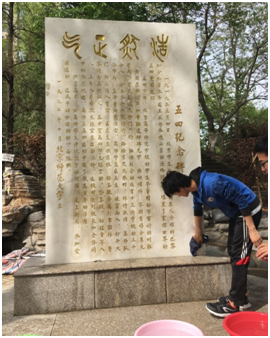 活动当日天气晴朗,下午2:30同学们来到五四纪念碑前,首先由支部书记讲解五四运动期间所涌现的代表人物及北师大学生参加五四运动的历史,让同学们能更多地了解五四岁月。讲解结束后,同学们自由参观。由于纪念碑附近在较长一段时间处于施工状态,纪念碑有较多尘埃覆盖,同学志愿清洗纪念碑,以微弱但更实际的行动向五四精神致敬。