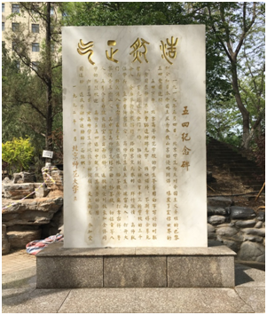师生在图书馆前修建五四纪念亭。1992年,在亭内建立五四纪念碑,汉白玉纪念碑的碑身正面上方篆书“浩然正气”。