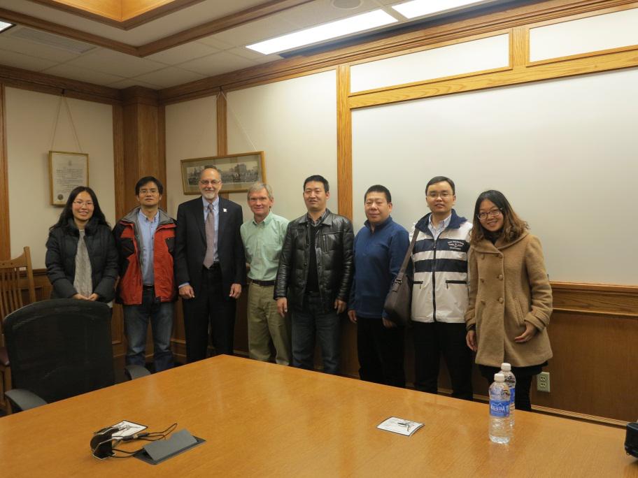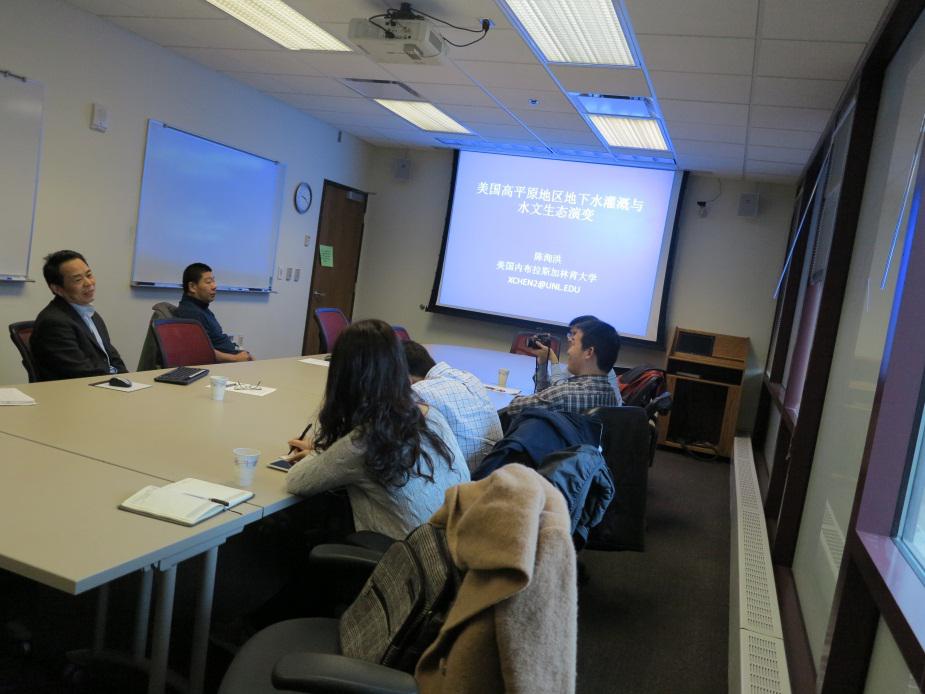 内布拉斯加大学林肯分校(University of Nebraska Lincoln)是位于美国中西部的著名公立综合性大学,是内布拉斯加州最顶尖的大学。该校教学严谨且研究成果丰富被誉为公立常青藤,其农业科学与自然资源学院长期居于世界领先地位。当地时间12月14日,我院师生听取了该校自然资源系Xunhong Chen(陈洵洪)教授以"美国高平原地区地下水灌溉与水文生态演变”为题目的学术汇报,陈教授介绍了美国高平原区含水层概况及近些年地下水灌溉产生的生态效应,并对林肯市境内普拉特河水文生态演变趋势及傍河取水应用现状作了详细阐述,指出地下水数值建模是实现河流-地下水一体化管理的重要途径。我院滕彦国教授则针对目前正在开展的国家重大水专项中"松花江流域傍河取水水质安全保障关键技术及示范”课题的研究内容和开展状况作了介绍,并与陈教授进行了深入探讨。通过本次座谈交流,让我们看到国内外水生态环境现状的差异以及国内外傍河取水研究侧重点的不同之处,同时也看到了国外傍河取水技术的优势所在,对接下来课题的实施提供了很好的借鉴作用。次日,跟内布拉斯加林肯大学校长Ron Yoder及自然资源系系主任 John P.Carroll进行了圆桌座谈。两位老师介绍了该大学的基本概况以及学科建设情况,并探讨了今后的交流合作方向,座谈会议圆满结束。