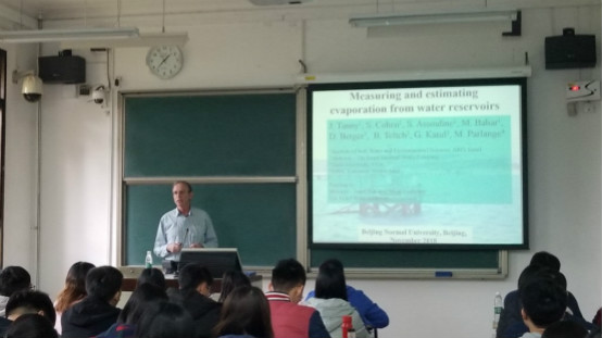 2018年10月27日,应我院刘海军教授的邀请,以色列农业研究组织水土环境研究所(Institute of Soil, Water and Environmental Sciences, Agricultural Research Organization, Israel)高级研究员,Josef Tanny教授对北师大水科院进行为期11天的来访,在此期间,Josef Tanny教授为我校师生带来了一次精彩的学术报告“Microclimate, evapotranspiration and water use efficiency”,和两次课程讲座,“Crop evapotranspiration–models and measurements”和“Evaporation from open water bodies”。 Josef Tanny教授的报告和课程受到了广大师生的热烈欢迎,现场座无虚席。