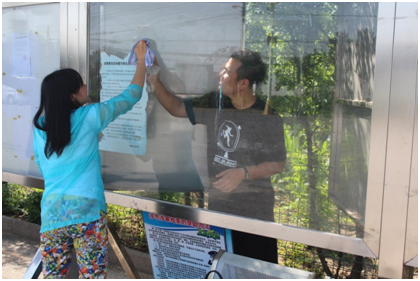 座谈结束后,同学们积极踊跃在村内开展环保活动,在村文化活动中心广场进行日常清洁工作,打扫卫生、擦玻璃、整理器材等,酷暑的夏天,同学们大汗淋漓,但并没有懈怠,认真清洁,宣传栏焕然一新。同学们的热情与认真也赢得了过往村民的好评和称赞。